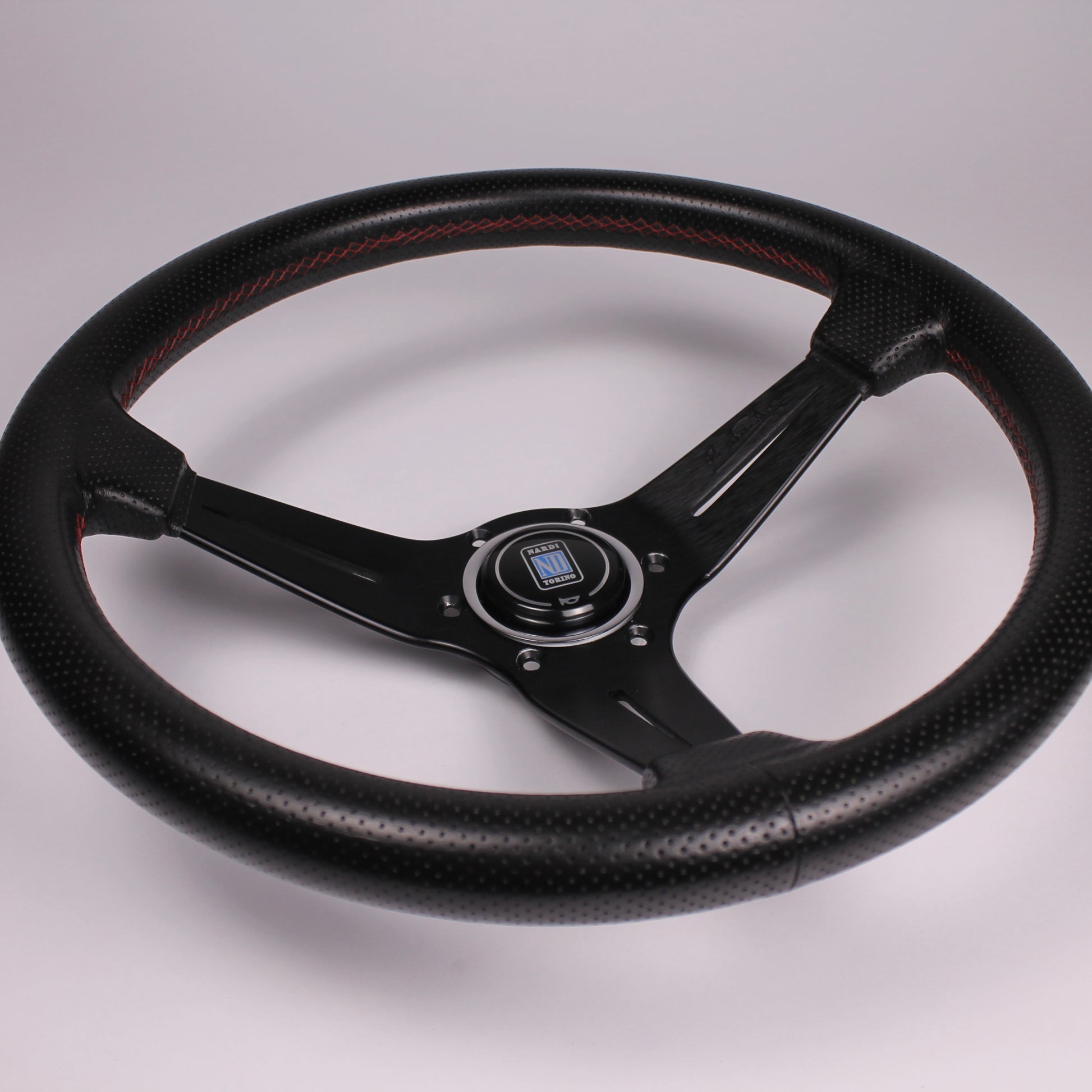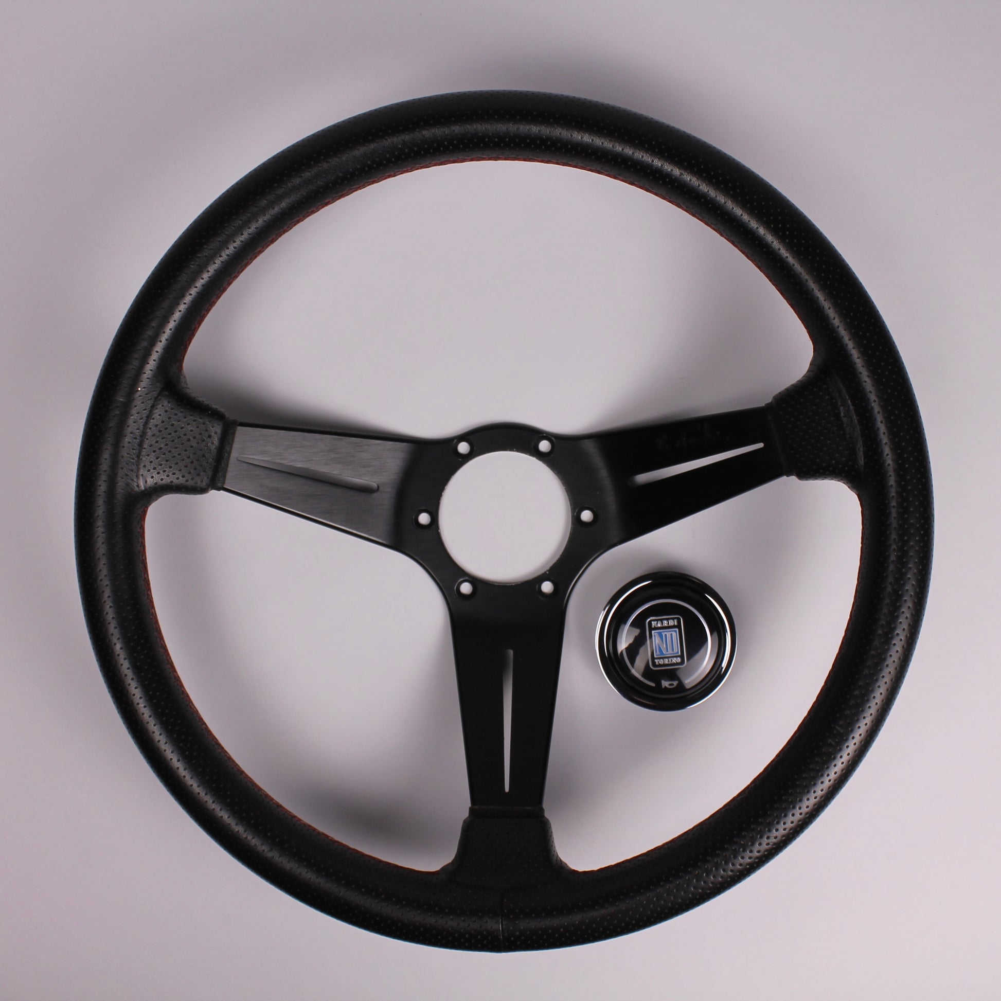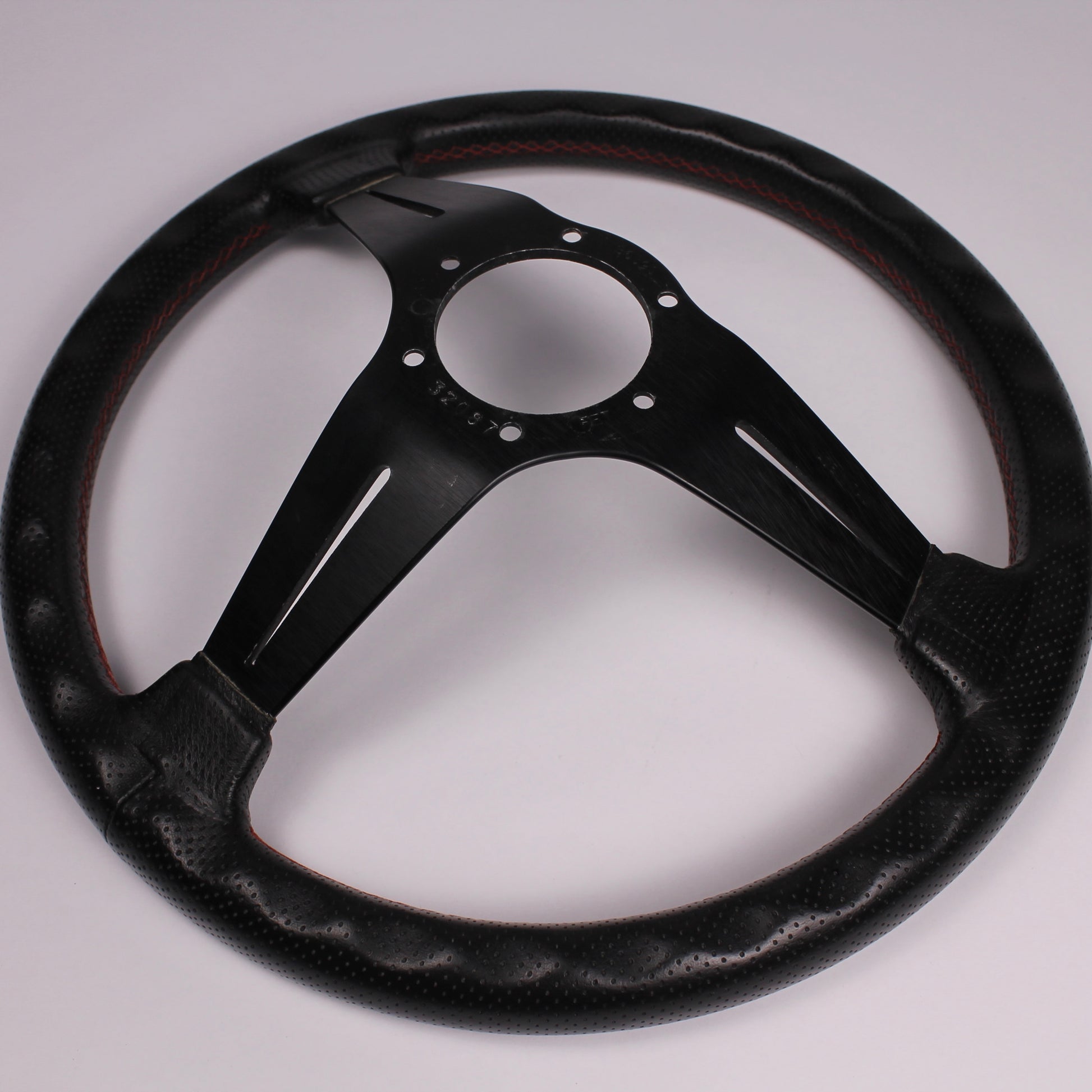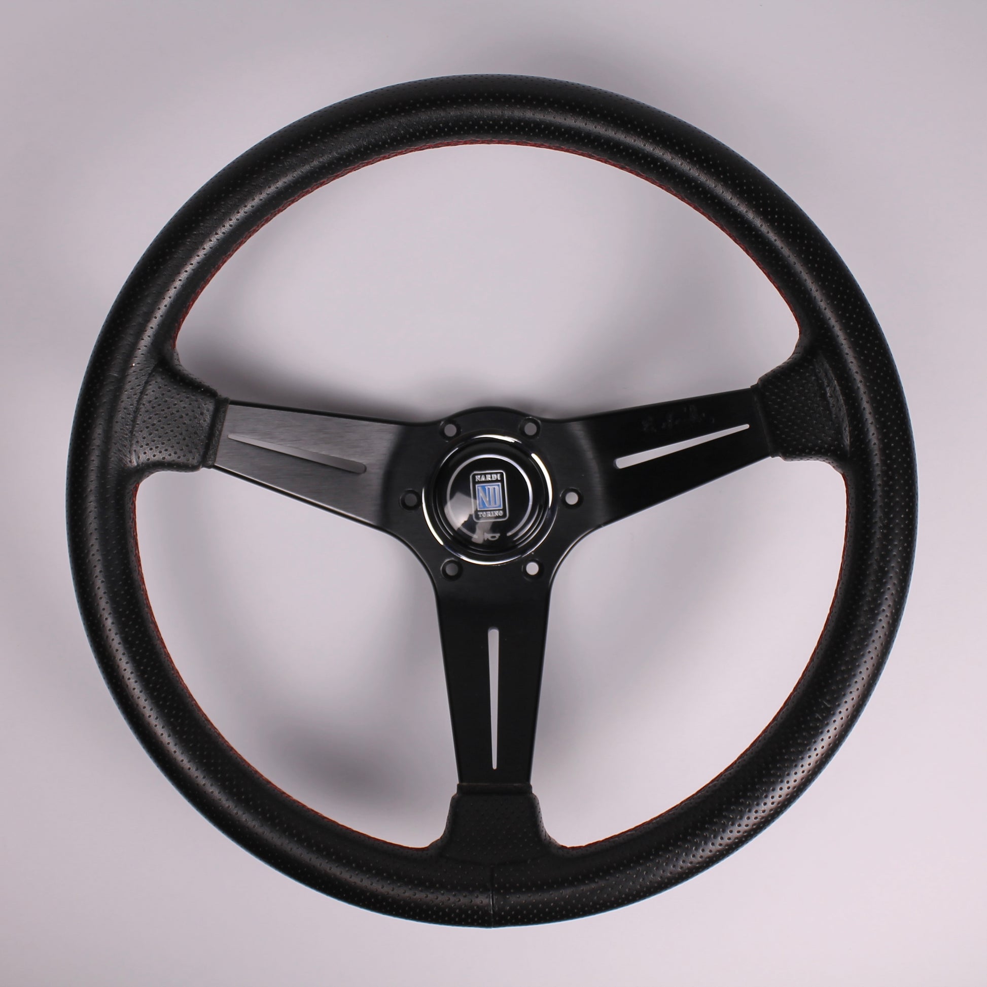 • Black perforated leather grip with red stitching